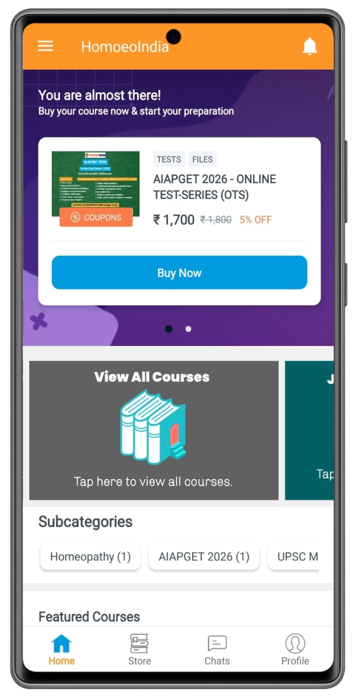 Download the HomoeoIndia App, log in with your mobile number + OTP, and your dashboard will show all available courses and test series. No complicated registration steps are needed.